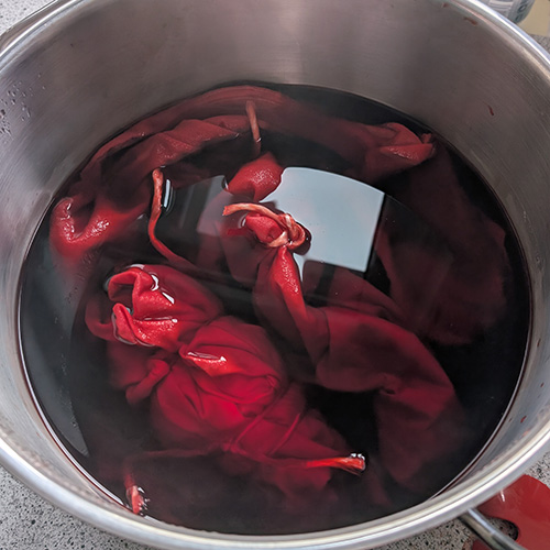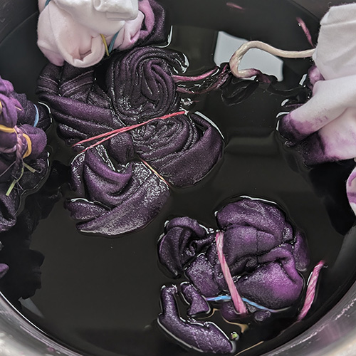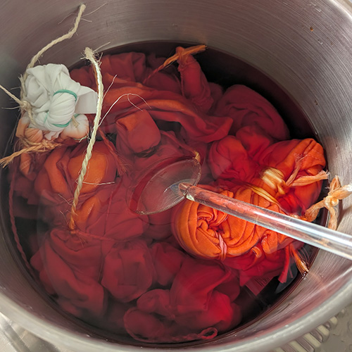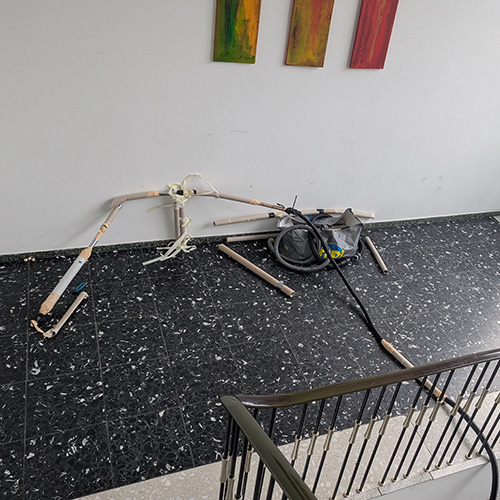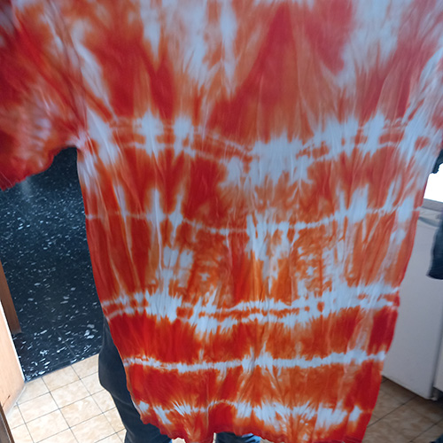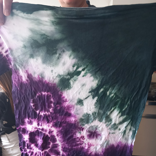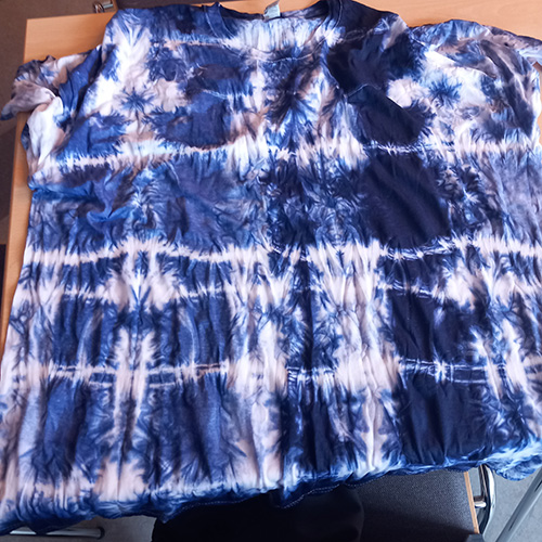 Anschließend ging es ans Batiken von T-Shirts, um sich schon einmal farblich auf den Frühling einzustimmen. Da das Färben etwas Zeit in Anspruch nimmt – etwa eine gute Stunde, dazu noch einmal rund eine Viertelstunde zum Fixieren – konnten einige eher technisch versierte Kinder gemeinsam mit dem väterlichen Begleitpersonal in der Zwischenzeit eine kleine symbolische Kugelbahn durch das Treppenhaus bauen.